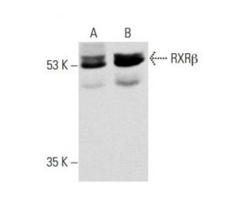 mouse monoclonal IgG1; RXRβ Antibody (11-13) is an IgG1 κ mouse monoclonal RXR beta antibody (also designated RXRβ antibody) that detects the RXR beta protein of human origin by WB, IP, IF and ELISA. RXRβ Antibody (11-13) is available as both the non-conjugated anti-RXR beta antibody form, as well as multiple conjugated forms of anti-RXR beta antibody, including agarose, HRP, PE, FITC and multiple Alexa Fluor® conjugates. Two families of retinoid receptors, RARs and RXRs, have been identified. Retinoic acid receptors (RARs) include RARα, RARβ and RARγ, each of which have a high affinity for all trans-retinoic acids and belong to the same class of nuclear transcription factors as thyroid hormone receptors, vitamin D3 receptor and ecdysone receptor. The ligand-binding domains of the RARs are highly conserved and RAR isoforms are expressed in distinct patterns throughout development and in the mature organism. Members of the retinoid X receptor (RXR) family, RXRα, RXRβ and RXRγ, are activated by 9-cis-RA, a stereo- and photo-isomer of all trans-RA that is expressed in vivo in both liver and kidney and may represent a widely used hormone. As is true for the RAR subfamily, the RXR receptors are closely related to each other both in their DNA-binding and ligand-binding domains and are encoded by separate genes at distinct chromosomal loci.
