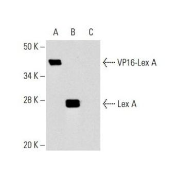 mouse monoclonal IgG1; Lex A Antibody (2-12) is an IgG1 κ mouse monoclonal Lex A antibody that detects Lex A and Lex A fusion proteins by WB, IP and IF. Lex A Antibody (2-12) is available as the non-conjugated anti-Lex A antibody form, as well as multiple conjugated forms of anti-Lex A antibody, including agarose, HRP, PE, FITC and multiple Alexa Fluor® conjugates. The GAL4 protein of Saccharomyces cerevisiae is one of the most thoroughly characterized transcriptional activators. Since the N-terminal 147 amino acid residues of GAL4 are sufficient to mediate specific and strong binding to DNA, but are incapable of efficient transcriptional activation, this protein fragment has frequently been used to confer specific DNA binding in experiments examining transcriptional activation functions of heterologous proteins. This approach is facilitated by the finding that higher eukaryotes lack endogenous proteins that enhance transcription from the consensus GAL4-binding site. Fusions between GAL4 (aa 1-147) and activating domains from a variety of transcriptional regulatory proteins can activate transcription in yeast, plant, insects and mammalian cells. A unique "two-hybrid" system has been developed using GAL4 fusions in yeast to identify specific protein-protein interactions. Another "two-hybrid" system utilizes the DNA binding domain of the E. coli protein Lex A and the transactivity domain of the HSV protein VP16.