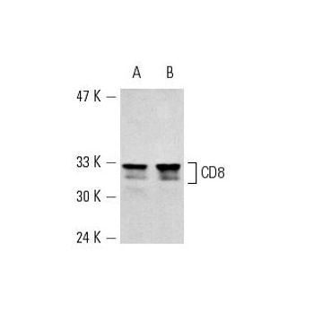 mouse monoclonal IgG2a; CD8-α Antibody (D-9) is an IgG2a κ mouse monoclonal CD8-alpha antibody (also designated MAL antibody, T-lymphocyte differentiation antigen T8/Leu-2 antibody or CD8A antibody) that detects the CD8-alpha protein of mouse, rat and human origin by WB, IP, IF, IHC(P) and ELISA. CD8-α Antibody (D-9) is available as both the non-conjugated anti-CD8-alpha antibody form, as well as multiple conjugated forms of anti-CD8-alpha antibody, including agarose, HRP, PE, FITC and multiple Alexa Fluor® conjugates. The T cell receptor (TCR) is a heterodimer composed of either α and β or γ and δ chains. CD3 chains and the CD4 or CD8 (CD8-α and CD8-β) co-receptors are also required for efficient signal transduction through the TCR. The TCR is expressed on T helper and T cytotoxic cells that can be distinguished by their expression of CD4 and CD8 proteins; T helper cells express CD4 proteins and T cytotoxic cells display CD8 proteins. CD8s are cell surface glycoproteins that exist as two chain complex (αα or αβ) receptors that bind class I MHC molecules presented by the antigen-presenting cell (APC). A primary function of CD8 proteins is to facilitate antigen recognition by the TCR and to strengthen the avidity of the TCR-antigen interactions. An additional role for CD8-expressing T cells may be to maintain low levels of HIV expression.