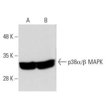 mouse monoclonal IgG1; p38 alpha/beta MAPK Antibody (A-12) is an IgG1 κ mouse monoclonal p38 alpha/beta MAPK antibody (also designated p38α/β antibody, MAPK14/MAPK11 antibody, SAPK2A/SAPK2B antibody or p38a/p38b antibody) that detects the p38 alpha/beta MAPK protein of mouse, rat and human origin by WB, IP, IF, IHC(P), FCM and ELISA. p38 alpha/beta MAPK Antibody (A-12) is available as both the non-conjugated anti-p38 alpha/beta MAPK antibody form, as well as multiple conjugated forms of anti-p38 alpha/beta MAPK antibody, including agarose, HRP, PE, FITC and multiple Alexa Fluor® conjugates. MAP (mitogen-activated protein) kinases play a significant role in many biological processes, including cell adhesion and spreading, cell differentiation and apoptosis. p38 alpha MAPK14, p38 beta MAPK11 and p38 gamma MAPK12 each contain one protein kinase domain and belong to the MAP kinase family. Expressed in different areas throughout the body with common expression patterns in heart, p38 proteins use magnesium as a cofactor to catalyze the ATP-dependent phosphorylation of target proteins. Via their catalytic activity, p38 alpha MAPK14, p38 beta MAPK11 and p38 gamma MAPK12 are involved in a variety of events throughout the cell, including signal transduction pathways, cytokine production and cell proliferation and differentiation. The p38 proteins are subject to phosphoryation on Thr and Tyr residues, an event which is thought to activate the phosphorylated protein.