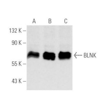 mouse monoclonal IgG2a; BLNK Antibody (2B11) is an IgG2a κ mouse monoclonal BLNK antibody (also designated B-cell adapter containing SH2 domain (BASH) antibody, Src homology [SH2] domain-containing leukocyte protein of 65 kD (SLP-65) antibody, SLP65 antibody, B-cell activation (BCA) protein antibody, B cell / macrophage spatial temporal signaling regulator antibody, or leucine zipper motif, proline-rich region, C-terminal SH2 domain containing protein antibody) that detects the BLNK protein of mouse, rat and human origin by WB, IP, IF, IHC(P) and ELISA. BLNK Antibody (2B11) is available as both the non-conjugated anti-BLNK antibody form, as well as multiple conjugated forms of anti-BLNK antibody, including agarose, HRP, PE, FITC and multiple Alexa Fluor® conjugates. Cross-linking of the B cell receptor (BCR) activates a variety of signaling pathways involved in processes such as cell proliferation and apoptosis. Intracellular protein tyrosine kinases such as Syk and Lyn have been implicated in this BCR signal transduction and are thought to play an important role in B cell development. BLNK (for B cell linker protein) is a central linker protein in B cells which has been shown to associate with the effector proteins GRB2, Vav, Nck and PLC γ following activation of the B cell receptor. The two forms of BLNK, pp68 and pp70, arise from alternate splicing of the human BLNK gene transcript. BLNK is phosphorylated by the Syk tyrosine kinase, which in turn permits activation of downstream effector proteins including GRB2 and PLC γ.