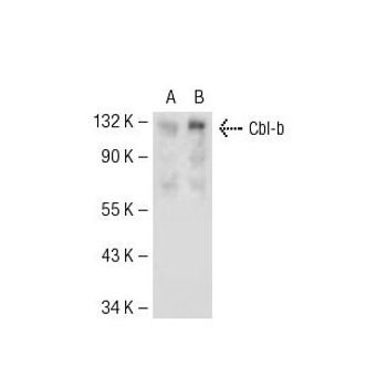mouse monoclonal IgG1; Cbl-b Antibody (G-1) is an IgG1 κ mouse monoclonal Cbl-b antibody (also designated Cbl proto-oncogene B (CBLB) antibody, E3 ubiquitin-protein ligase antibody, or RNF56 antibody) that detects the Cbl-b protein of mouse, rat and human origin by WB, IP, IF, IHC(P) and ELISA. Cbl-b Antibody (G-1) is available as both the non-conjugated anti-Cbl-b antibody form, as well as multiple conjugated forms of anti-Cbl-b antibody, including agarose, HRP, PE, FITC and multiple Alexa Fluor® conjugates. Cbl (also designated the c-Cbl proto-oncogene, E3 ubiquitin-protein ligase CBL, Casitas B-lineage lymphoma proto-oncogene, and RING finger protein 55) has been identified as the cellular homolog of the v-Cbl oncogene isolated from an NFS/N mouse that developed a pre-B cell lymphoma following infection with the replication-competent Cas Br-M murine leukemic virus. c-Cbl is expressed at relatively high levels in a wide range of hematopoietic tumor cell lines as well as in normal tissues such as thymus and testis. The c-Cbl gene product has been identified as a cytoplasmic protein with apparent DNA binding and dimerization domains characteristic of transcription factors. A single c-Cbl locus termed CBL2 has been mapped to human chromosome 11q23. This region of chromosome 11 is involved in translocations and deletions in a broad range of leukemias; c-Cbl has been found to be translocated from chromosome 11 in leukemias with either t(4;11) or t(11;14) abnormalities. Two proteins related to c-Cbl have been identified as Cbl-b (RING finger protein 56) and Cbl-3 (RING finger protein 57). Cbl-b has a proline-rich domain, a nuclear localization signal, a C3HC4 zinc finger and a putative leucine zipper. Cbl-b is expressed in normal and malignant mammary epithelial cells, various normal tissues and hematopoietic tissue and cell lines. Data suggests that Cbl-b encodes a protein that can interact with signal transduction proteins to regulate their function or be regulated by them.