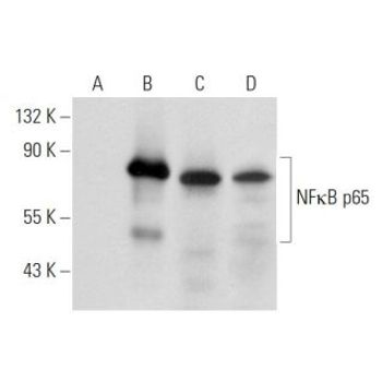 mouse monoclonal IgG1; NFκB p65 Antibody (F-6) is an IgG1 κ mouse monoclonal NF kappa B p65 antibody (also designated RelA antibody, p65 antibody or NFKB3 antibody) that detects the NF kappa B p65 protein of mouse, rat and human origin by WB, IP, IF, IHC(P), FCM and ELISA. NFκB p65 Antibody (F-6) is available as both the non-conjugated anti-NF kappa B p65 antibody form, as well as multiple conjugated forms of anti-NF kappa B p65 antibody, including agarose, HRP, PE, FITC and multiple Alexa Fluor® conjugates. Proteins encoded by the v-Rel viral oncogene and its cellular homolog, c-Rel, are members of a family of transcription factors that include the two subunits of the transcription factor NκB (p50 and p65) and the Drosophila maternal morphogen, dorsal. Both proteins specifically bind to DNA sequences that are the same or slight variations of the 10 bp κB sequence in the immunoglobulin κ light chain enhancer. This same sequence is also present in a number of other cellular and viral enhancers. The DNA binding activity of NFκB is activated and NFκB is subsequently transported from the cytoplasm to the nucleus in cells exposed to mitogens or growth factors. cDNAs encoding precursors for two distinct proteins of the same size have been described, designated p105 and p100. The p105 precursor contains p50 at its N-terminus and a C-terminal region that when expressed as a separate molecule, designated pdI, binds to p50 and regulates its activity.