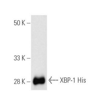 mouse monoclonal IgG1; XBP-1 Antibody (F-4) is an IgG1 κ mouse monoclonal XBP-1 antibody (also designated XBP1 antibody) that detects the XBP-1 protein of mouse, rat and human origin by WB, IP, IF and ELISA. XBP-1 Antibody (F-4) is available as both the non-conjugated anti-XBP-1 antibody form, as well as multiple conjugated forms of anti-XBP-1 antibody, including agarose, HRP, PE, FITC and multiple Alexa Fluor® conjugates. The X-box binding protein-1 (XBP-1 or hXBP-1), also designated tax-responsive element-binding protein 5 (TREB5) in mouse and human, or hepatocarcinogenesis-related transcription factor (HTF) in rat, belongs to the basic region/leucine zipper (bZIP) family of transcription factors. XBP-1 was first characterized as a protein that binds to the HLA-DRα promoter in B cells. XBP-1 recognizes the cAMP responsive element (CRE) in enhancers of human T cell leukemia virus and major histocompatibility complex class II genes and activates transcription of these genes. It is expressed at high levels in developing bone and its levels are modulated during osteoblast development, suggesting a role in regulation of expression of osteoblast-specific genes. In addition to binding to CRE sequences, XBP-1 has been shown to bind to TPA response elements (TREs).