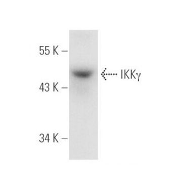 mouse monoclonal IgG1; IKKγ Antibody (B-3) is an IgG1 κ mouse monoclonal IKKγ antibody (also designated IKKγ antibody or NEMO antibody) that detects IKKγ of mouse, rat and human origin by WB, IP, IF and ELISA. IKKγ Antibody (B-3) is available as the non-conjugated anti-IKKγ antibody form, as well as multiple conjugated forms of anti-IKKγ antibody, including agarose, HRP, PE, FITC and multiple Alexa Fluor® conjugates. The transcription factor NFkB is retained in the cytoplasm in an inactive form by the inhibitory protein IkB. Activation of NFkB requires that IkB be phosphorylated on specific serine residues, which results in targeted degradation of IkB. IkB kinase α (IKKα), previously designated CHUK, interacts with IkB-α and specifically phosphorylates IκBα on Serine 32 and 36, the sites that trigger its degradation. IKKα appears to be critical for NFkB activation in response to proinflammatory cytokines. Phosphorylation of IkB by IKKα is stimulated by the NFkB inducing kinase (NIK), which itself is a central regulator for NFkB activation in response to TNF and IL-1. The functional IKK complex contains three subunits, IKKα, IKKβ and IKKγ (also designated NEMO), and each appear to make essential contributions to IkB phosphorylation.