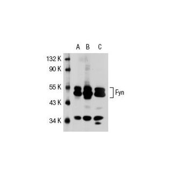 mouse monoclonal IgG2a; c-Src Antibody (B-12) is an IgG2a κ mouse monoclonal c-Src antibody (also designated Rous sarcoma (SRC) virus proto-oncogene, non-receptor tyrosine kinase antibody or SRC antibody) that detects the c-Src protein of mouse, rat and human origin by WB, IP, IF, IHC(P) and ELISA. c-Src Antibody (B-12) is available as both the non-conjugated anti-c-Src antibody form, as well as multiple conjugated forms of anti-c-Src antibody, including agarose, HRP, PE, FITC and multiple Alexa Fluor® conjugates. The major translational products of the Src gene family are membrane-associated tyrosine protein kinases that lack transmembrane and external amino acid sequences. By virtue of their common structural motifs, the Src family is composed of nine members in vertebrates, including c-Src, c-Yes, Fgr, Yrk, Fyn, Lyn, Hck, Lck and Blk. Src family kinases, which contain an amino-terminal cell membrane anchor followed by SH3 and SH2 domains, transduce signals that are involved in the control of a variety of cellular processes, including proliferation, differentiation, motility and adhesion. Src family members are normally maintained in an inactive state and can be activated transiently during cellular events such as mitosis. Different subcellular locations of Src family kinases may be important for the regulation of specific cellular processes, such as mitogenesis, cytoskeletal organization and membrane trafficking. c-Src (also designated pp60Src, Src p60 and proto-oncogene tyrosine protein kinase Src) is expressed in a broad range of tissue and cell types, although the highest levels of c-Src are detected in neuronal tissues and platelets. c-Src may play a role in events associated with both neuronal differentiation and maintenance of mature neuronal cell functions.