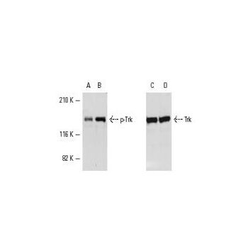 mouse monoclonal IgG1; p-Trk Antibody (E-6) is an IgG1 κ mouse monoclonal p-Trk antibody (also designated p-Trk antibody or Pan Trk antibody) that detects Trk A phosphorylated at Tyr 496 and correspondingly phosphorylated Trk B and Trk C of mouse, rat and human origin by WB, IP, IF, IHC(P) and ELISA. p-Trk Antibody (E-6) is available as the non-conjugated anti-p-Trk antibody form, as well as multiple conjugated forms of anti-p-Trk antibody, including agarose, HRP, PE, FITC and multiple Alexa Fluor® conjugates. The Trk proto-oncogene encodes a membrane-spanning protein tyrosine kinase, Trk gp140, also designated Trk A, whose expression is restricted in vivo to neurons of the sensory spinal and cranial ganglia of neural crest origin. Nerve growth factor (NGF) stimulates tyrosine phosphorylation of Trk A in neural cell lines and in embryonic dorsal root ganglia. Tyrosine phosphorylation of Trk by NGF is rapid, specific and occurs with picomolar quantities of factor, indicating that the response is mediated by physiological amounts of NGF. Unlike Trk A, tyrosine phosphorylation of Trk B is induced by the brain-derived neurotrophic factor (BDNF) and, to a lesser extent, neurotrophin-3 (NT-3). Additionally, Trk C phosphorylation is induced via interaction with endogenously produced NT-3 and is not dependent on stimulation by NGF.
