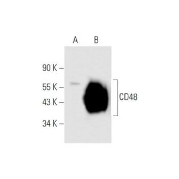 mouse monoclonal IgG2a; CD48 Antibody (5-4.8) is an IgG2a κ mouse monoclonal CD48 antibody (also designated CD48 antibody) that detects the CD48 protein of mouse, rat and human origin by WB, IP, IF, FCM and ELISA. CD48 Antibody (5-4.8) is available as both the non-conjugated anti-CD48 antibody form, as well as multiple conjugated forms of anti-CD48 antibody, including agarose, HRP, PE, FITC and multiple Alexa Fluor® conjugates. CD48 is a GPI-anchored glycoprotein that may act as a low affinity receptor for CD2. CD48 is expressed on all peripheral blood T, B and null cells, thymocytes, eosinophils, a portion of bone marrow cells and some epithelial cells. Rat CD48 is found on hematopoietic and endothelial cells, and mouse CD48 is found on thymocytes, lymph node cells, most macrophages and bone marrow cells. CD48 has been shown to be associated with the tyrosine kinase Lck.