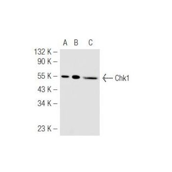 mouse monoclonal IgG2a; Chk1 Antibody (G-4) is an IgG2a κ mouse monoclonal Chk1 antibody (also designated CHEK1 antibody, or checkpoint kinase 1 antibody) that detects the Chek1 gene product of mouse, rat and human origin by WB, IP, IF, IHC(P), FCM and ELISA. Chk1 Antibody (G-4) is available as both the non-conjugated anti-Chk1 antibody form, as well as multiple conjugated forms of anti-Chk1 antibody, including agarose, PE, FITC and multiple Alexa Fluor® conjugates. Cell cycle events are regulated by the sequential activation and deactivation of cyclin dependent kinases (Cdks) and by proteolysis of cyclins. Chk1 and Chk2 are involved in these processes as regulators of Cdks. Chk1 and Chk2 both function as essential components in the G2 DNA damage checkpoint by phosphorylating Cdc25C in response to DNA damage. Phosphorylation inhibits Cdc25C activity, thereby blocking mitosis. Cdc25A, Cdc25B and Cdc25C protein tyrosine phosphatases function as mitotic activators by dephosphorylating Cdc2 p34 on regulatory tyrosine residues. It has also been shown that Chk1 can phosphorylate Wee1 in vitro, providing evidence that the hyperphosphorylated form of Wee1, seen in cells delayed by Chk1 overexpression, is due to phosphorylation by Chk1.