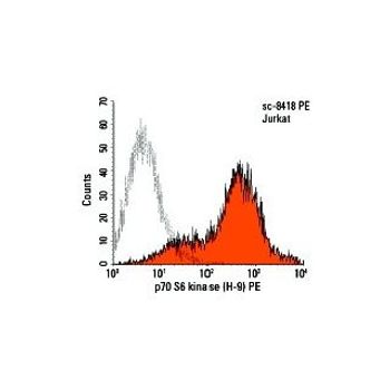 mouse monoclonal IgG1; p70 S6 kinase α Antibody (H-9) is an IgG1 κ mouse monoclonal p70 S6 kinase alpha antibody (also designated p70S6K antibody, PS6K antibody or RPS6KB1 ribosomal protein S6 kinase B1 antibody) that detects the p70 S6 kinase alpha protein of mouse, rat and human origin by WB, IP, IF, IHC(P), FCM and ELISA. p70 S6 kinase α Antibody (H-9) is available as both the non-conjugated anti-p70 S6 kinase alpha antibody form, as well as multiple conjugated forms of anti-p70 S6 kinase alpha antibody, including agarose, HRP, PE, FITC and multiple Alexa Fluor® conjugates. In studies to elucidate key regulatory pathways in signal transduction, several protein serine/threonine (Ser/Thr) kinases have been identified, including two distinct families of 40S ribosomal protein S6 Ser/Thr kinases present in somatic animal cells, designated p70 S6 kinase and p90 Rsk kinase. p90 Rsk kinase is maximally activated within minutes of addition of growth factors or phorbol ester to cultured cells followed by activation of p70 S6 kinase. Both enzymes are regulated by serine/threonine phosphorylation, suggesting that specific kinases may exist upstream in the signaling pathway that regulate these kinases. In fact, evidence suggests that one such family of activating enzymes includes the members of the ERK MAP kinase family. The ERK MAP kinases are, in turn, regulated by phosphorylation at threonine and tyrosine residues by a protein kinase designated MEK.
