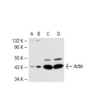 mouse monoclonal IgG1; Actin Antibody (C-2) is an IgG1 κ mouse monoclonal Actin antibody (also designated β Actin antibody) that detects the Actin protein of mouse, rat, human and Xenopus laevis origin by WB, IP, IF, IHC(P), FCM and ELISA. Actin Antibody (C-2) is available as both the non-conjugated anti-Actin antibody form, as well as multiple conjugated forms of anti-Actin antibody, including agarose, HRP, PE, FITC and multiple Alexa Fluor® conjugates. All eukaryotic cells express Actin, which often constitutes as much as 50% of total cellular protein. Actin filaments can form both stable and labile structures and are crucial components of microvilli and the contractile apparatus of muscle cells. While lower eukaryotes, such as yeast, have only one Actin gene, higher eukaryotes have several isoforms encoded by a family of genes. At least six types of Actin are present in mammalian tissues and fall into three classes. α-Actin expression is limited to various types of muscle, whereas β-Actin and γ-Actin are the principle constituents of filaments in other tissues. Members of the small GTPase family regulate the organization of the Actin cytoskeleton. Rho controls the assembly of Actin stress fibers and focal adhesion. Rac regulates Actin filament accumulation at the plasma membrane. Cdc42 stimulates formation of filopodia.
