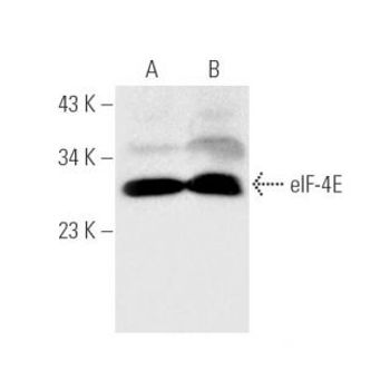 mouse monoclonal IgG1; eIF4E Antibody (P-2) is an IgG1 κ mouse monoclonal eIF4E antibody (also designated EIF4E antibody, or EIF4E1 antibody) that detects the eIF4E protein of mouse, rat, human and porcine origin by WB, IP, IF, IHC(P) and ELISA. eIF4E Antibody (P-2) is available as both the non-conjugated anti-eIF4E antibody form, as well as multiple conjugated forms of anti-eIF4E antibody, including agarose, HRP, PE, FITC and multiple Alexa Fluor® conjugates. The initiation of protein synthesis in eukaryotic cells is regulated by interactions between protein initiation factors and RNA molecules. The eukaryotic initiation complex eIF4F exists in vitro as a trimeric complex of eIF4E, eIF4A and eIF4G. Together, the complex allows ribosome binding to mRNA by inducing the unwinding of mRNA secondary structures. eIF4E binds to the mRNA "cap" during an early step in the initiation of protein synthesis. eIF4A acts as an ATP-dependent RNA helicase. eIF4G acts as a bridge between eIF4E, eIF4A and the eIF3 complex.