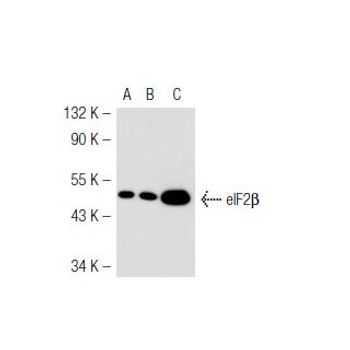 mouse monoclonal IgG1; eIF2β Antibody (P-3) is an IgG1 κ mouse monoclonal eIF2 beta antibody (also designated eIF2β antibody) that detects the eIF2 beta protein of mouse, rat and human origin by WB, IP, IF, IHC(P) and ELISA. eIF2β Antibody (P-3) is available as both the non-conjugated anti-eIF2 beta antibody form, as well as multiple conjugated forms of anti-eIF2 beta antibody, including agarose, HRP, PE, FITC and multiple Alexa Fluor® conjugates. The initiation of protein synthesis in eukaryotic cells is regulated by interactions between protein initiation factors and RNA molecules. The eukaryotic initiation complex eIF2B exists as a five subunit complex composed of eIF2Bα, eIF2Bβ, eIF2Bγ, eIF2Bδ, and eIF2Bε. The eIF2B complex catalyzes the exchange of GDP for GTP on the eIF2 complex, following the interaction of eIF2/GTP with the 40S ribosomal subunit. Guanine nucleotide exchange factor (GEF) activity is exhibited by the eIF2Bε subunit alone, but is greater in the presence of all five eIF2B subunits. Phosphorylation of eIF2 inhibits GEF activity of eIF2B, an inhibition that requires the eIF2Bα subunit.