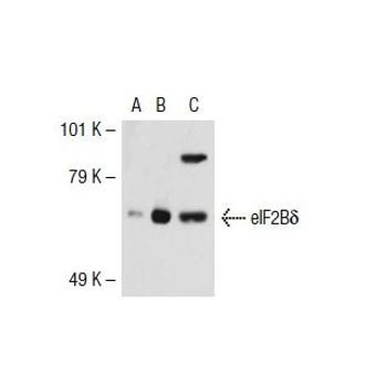 mouse monoclonal IgG2b; eIF2Bδ Antibody (P-6) is an IgG2b κ mouse monoclonal eIF2B delta antibody (also designated eIF2Bδ antibody) that detects the eIF2B delta protein of mouse, rat and human origin by WB, IP, IF and IHC(P). eIF2Bδ Antibody (P-6) is available as both the non-conjugated anti-eIF2B delta antibody form, as well as multiple conjugated forms of anti-eIF2B delta antibody, including agarose, HRP, PE, FITC and multiple Alexa Fluor® conjugates. The initiation of protein synthesis in eukaryotic cells is regulated by interactions between protein initiation factors and RNA molecules. The eukaryotic initiation complex eIF2B exists as a five subunit complex composed of eIF2Bα, eIF2Bβ, eIF2Bγ, eIF2Bδ, and eIF2Bε. The eIF2B complex catalyzes the exchange of GDP for GTP on the eIF2 complex, following the interaction of eIF2/GTP with the 40S ribosomal subunit. Guanine nucleotide exchange factor (GEF) activity is exhibited by the eIF2Bε subunit alone, but is greater in the presence of all five eIF2B subunits. Phosphorylation of eIF2 inhibits GEF activity of eIF2B, an inhibition that requires the eIF2Bα subunit.