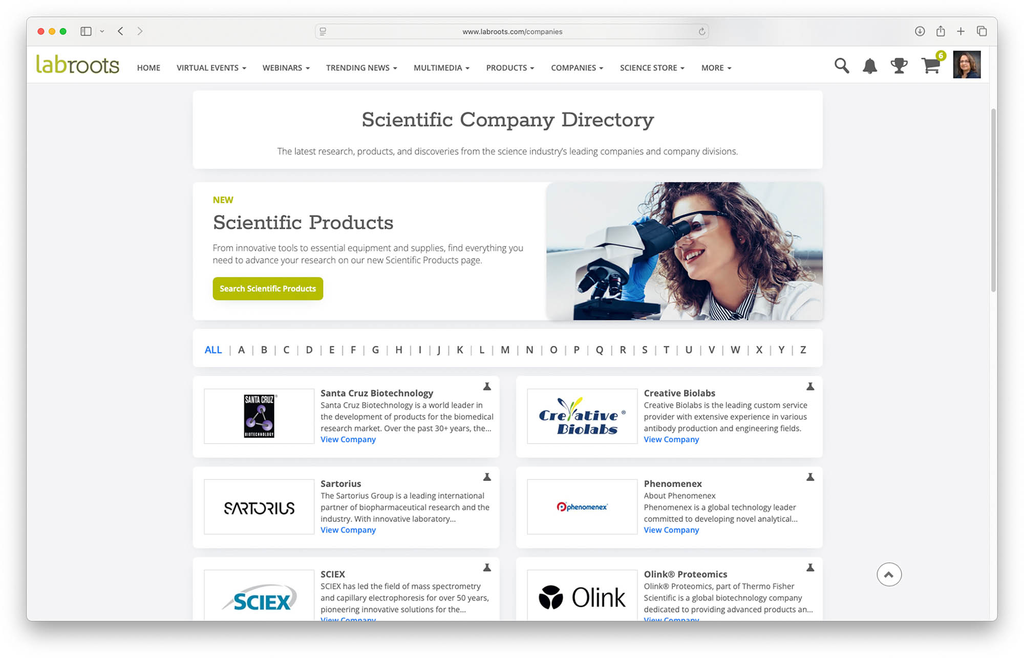 Get your products found online by prospective buyers and clients in the scientific industry. You’ll get the opportunity to highlight your catalog to a new, targeted audience with our comprehensive SEO-optimized scientific product database. With purchase of company product listings*, you will get a dedicated company page and, along with your product listings, the company page will be SEO optimized to improve searchability across the web. Additionally, your product listings will be marketed via our Labroots newsletters and on our social media pages.