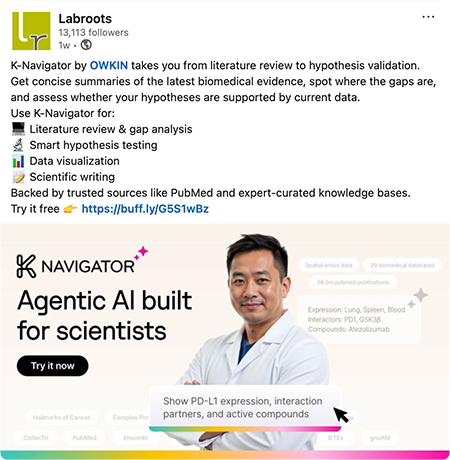 Collaborate with the Labroots team to create high-quality branded content just for you. This is a unique opportunity for companies looking to develop customized content crafted by industry professionals. Utilize Labroots’ database of users by sharing an article or infographic, written and designed by the Labroots team, in the Trending News section of the website. Crafted to resonate with your target audience, this content will promote your company as an industry leader and garner new leads.