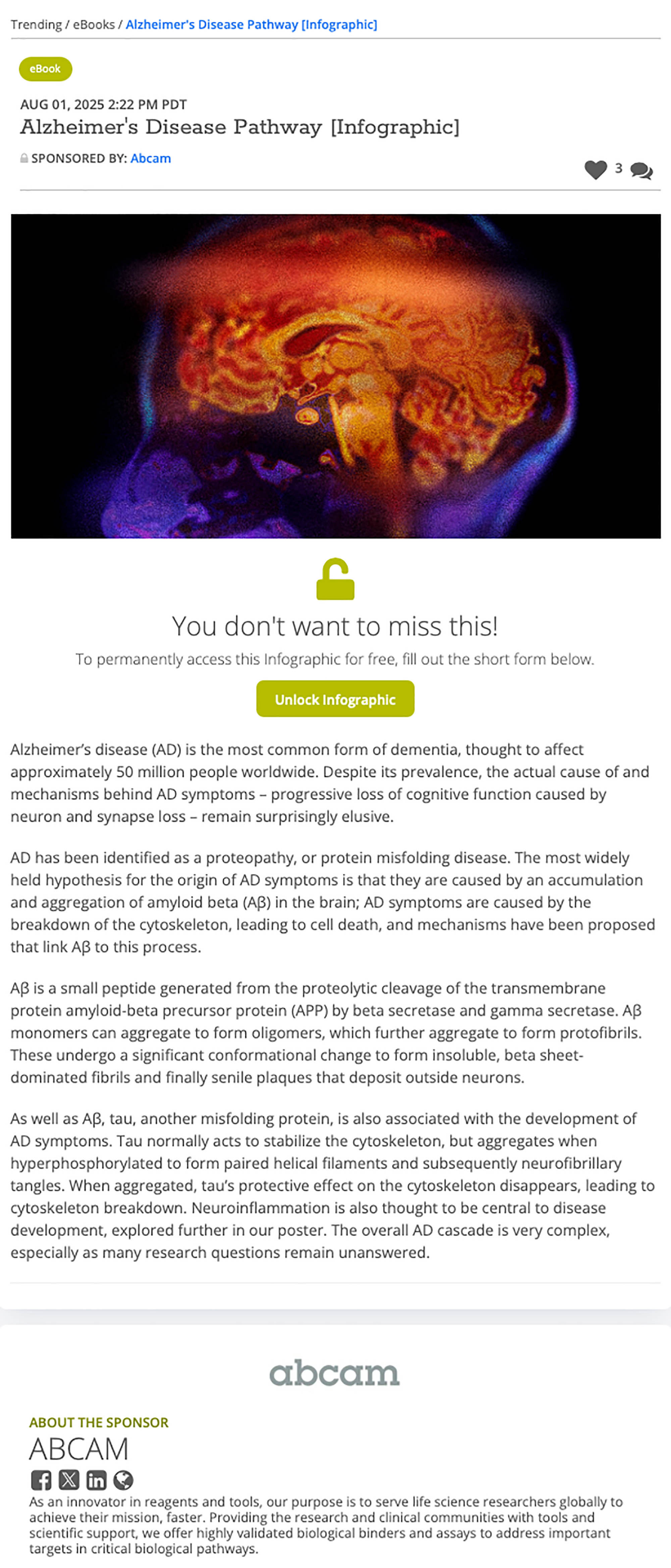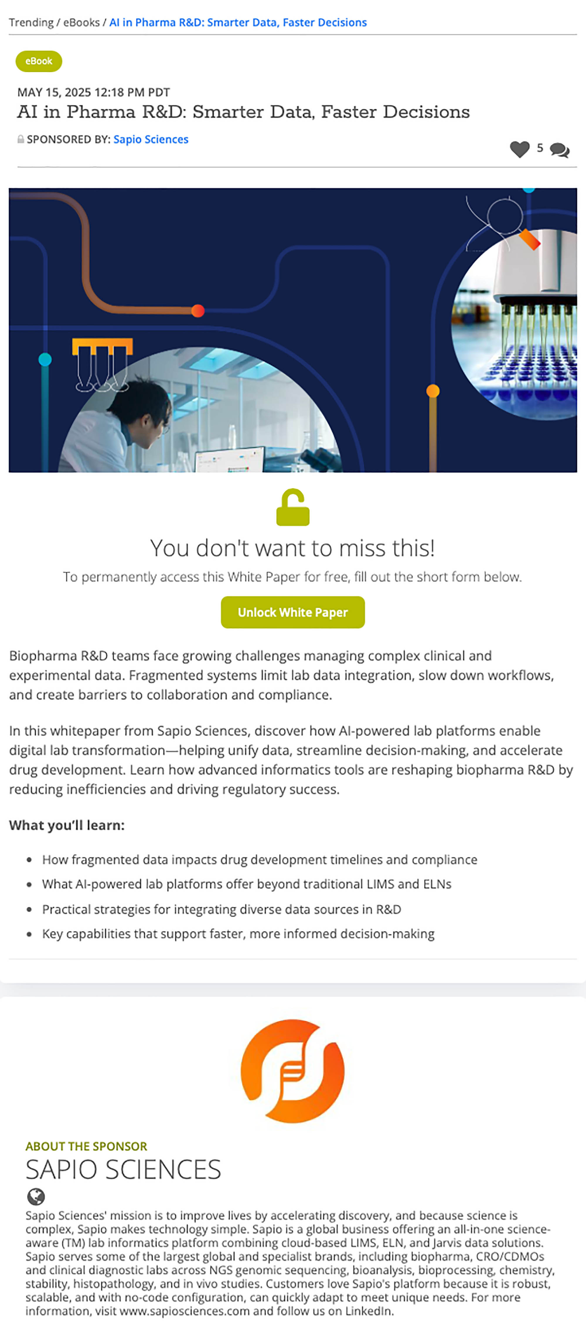 - Gated content (provided by you) housed on the Labroots site and shared on Labroots Trending News, with detailed company information shown as the “sponsor”, and up to eight in-article links