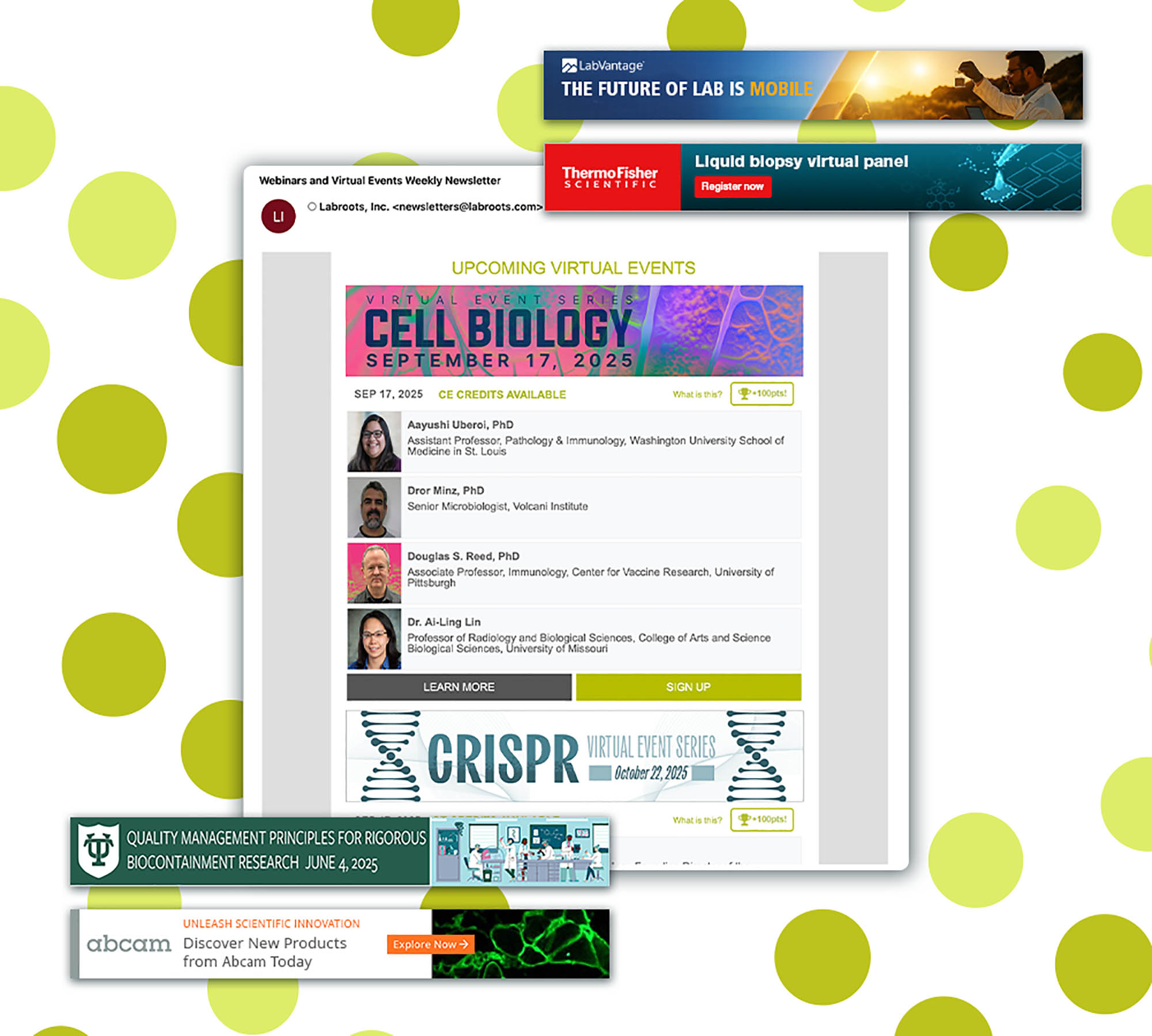 Become a part of our users' virtual experience. As a sponsor of one or more upcoming Labroots virtual events which stay on our website for users to experience the content on-demand, you're providing ongoing visibility to your company.