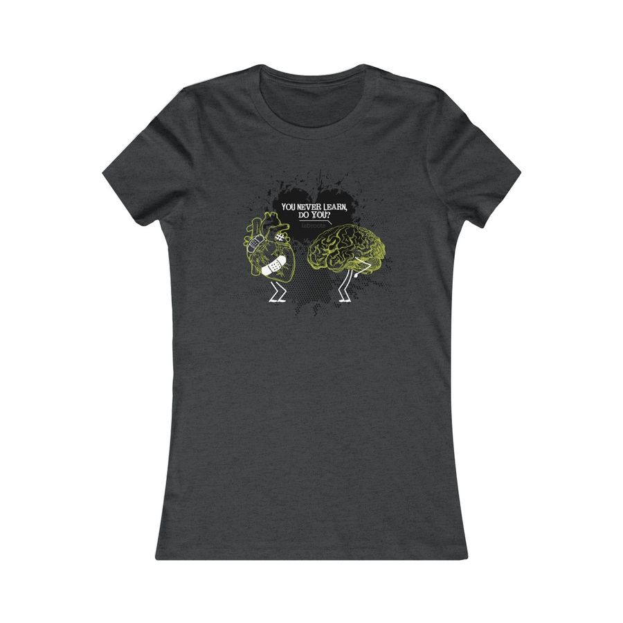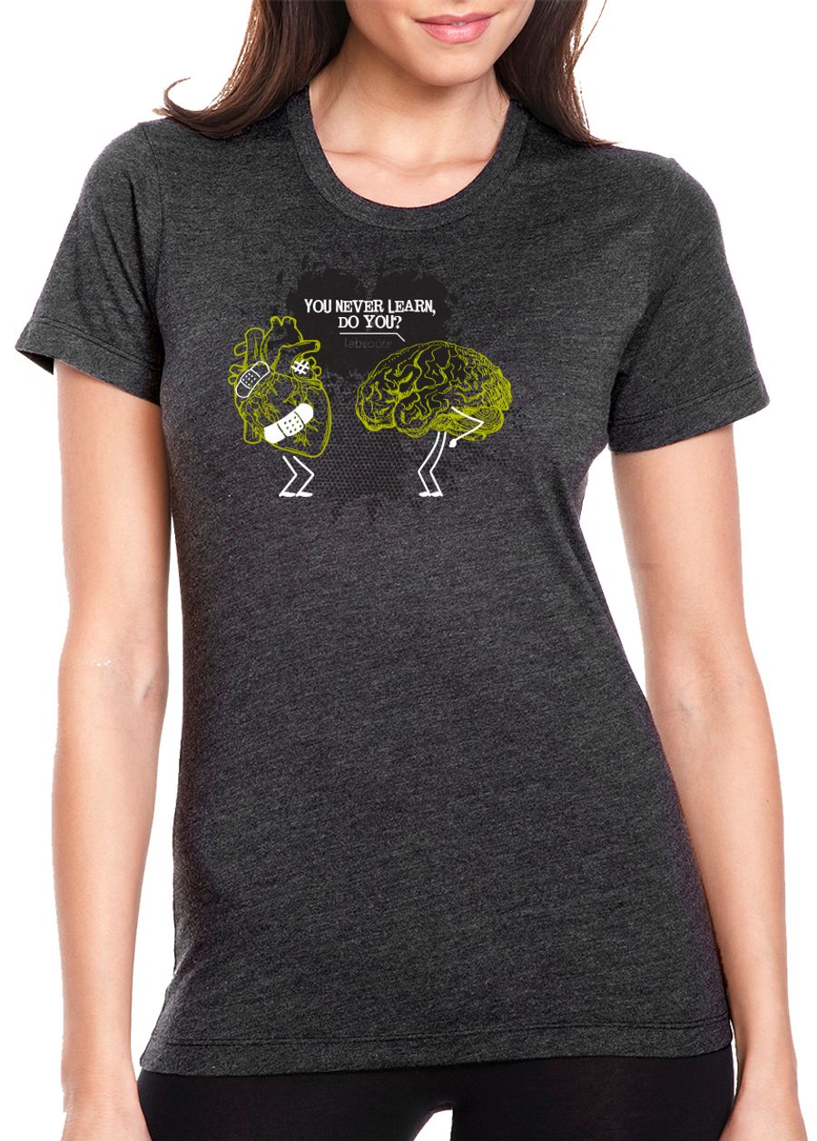 This playful design comically depicts a beaten heart, complete with bandages to conceal its wounds, and a talking brain exclaiming “You never learn, do you!” The tri-color design is set on a charcoal shirt, perfect for the neuroscientist, the intern and everyone in between who has been caught in the classic battle of head vs. heart.
