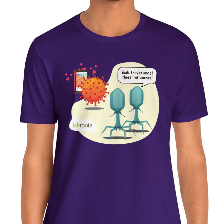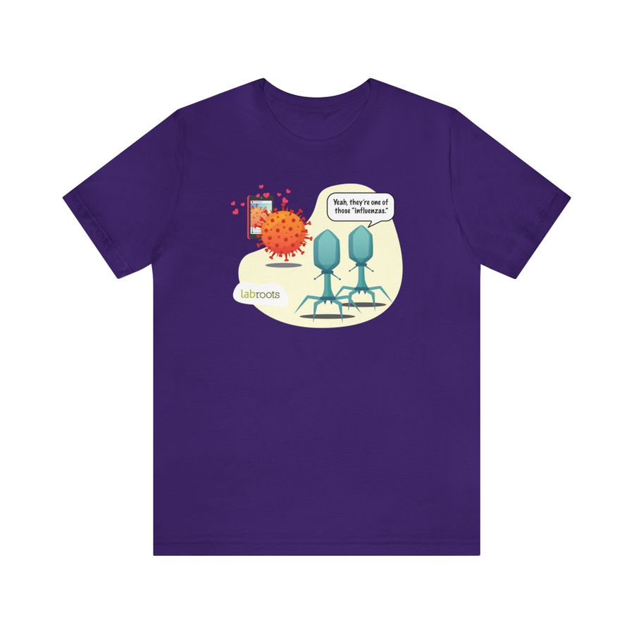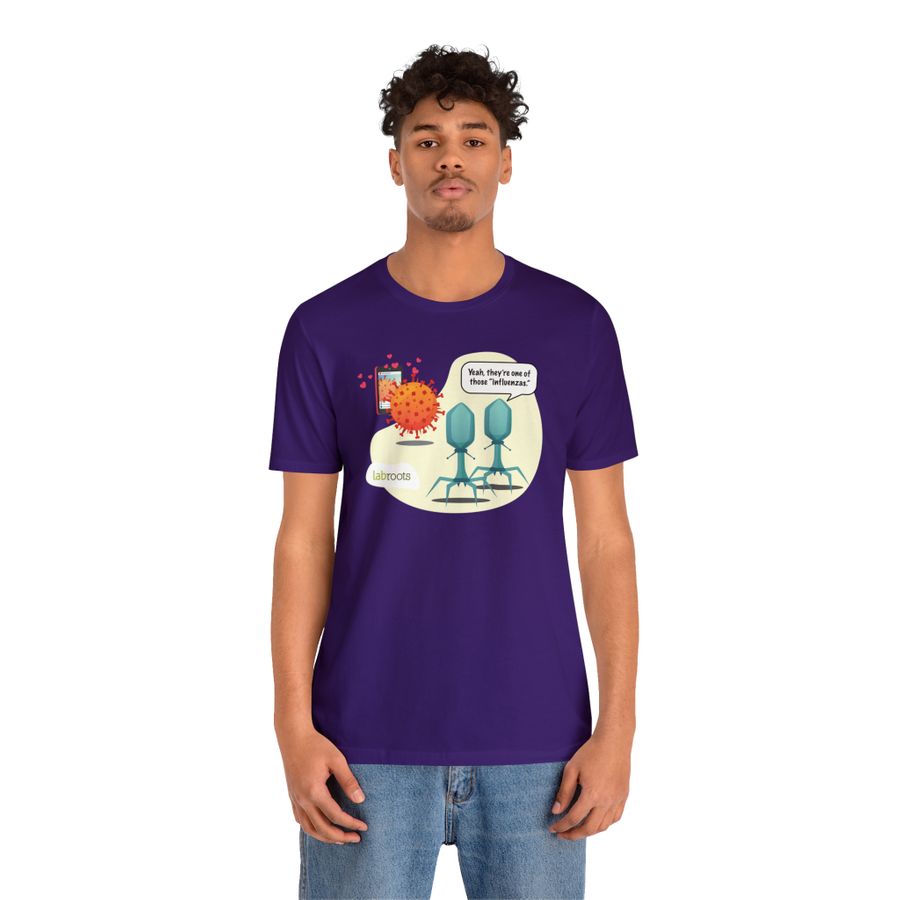 They're one of those 'influenzas.' This fun t-shirt is perfect for those who love a good science pun! Shirt fabric is a high-quality blend of 52% polyester/48% soft cotton, pre-washed to reduce shrinkage. The ultra-soft shirt provides ultimate comfort, complete with a tear away tag.