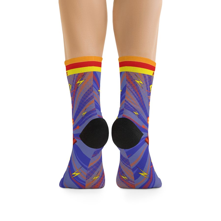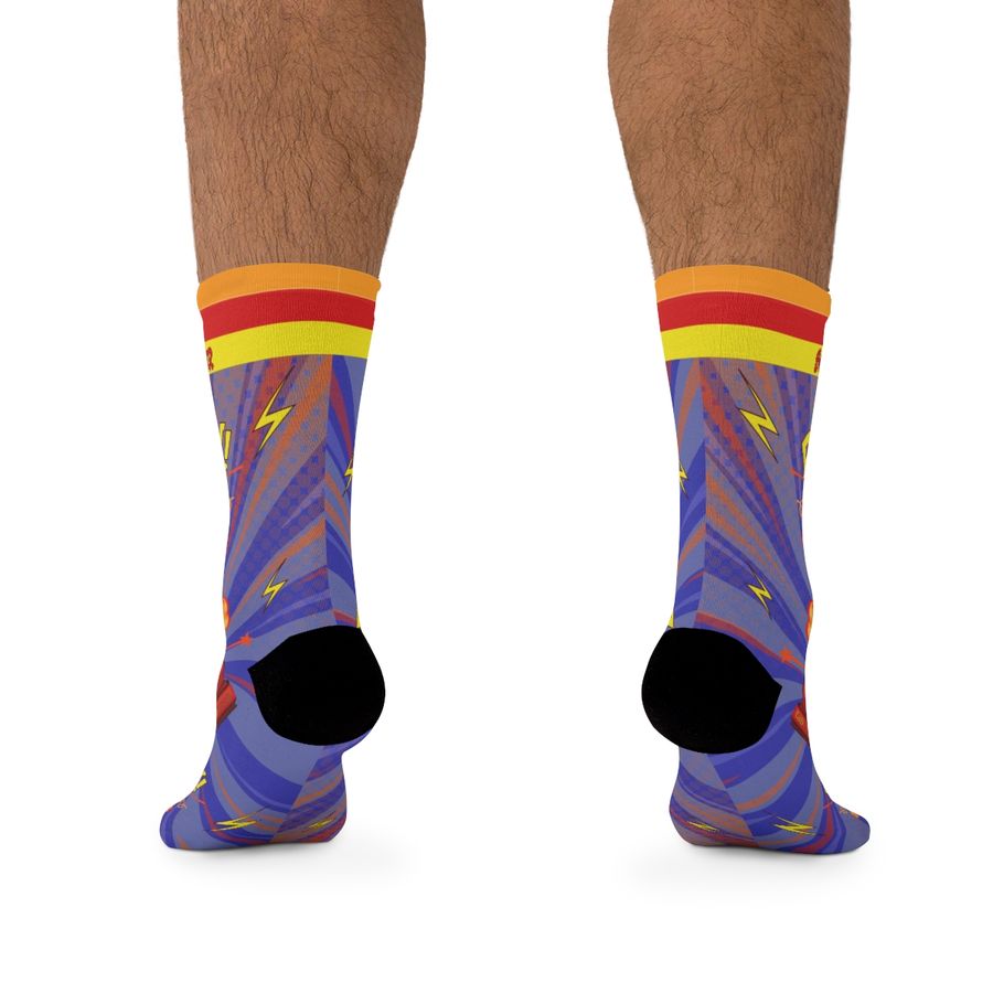 Let your socks speak for what every person would like to do when it comes to cancer. These blue and black socks showcase a red and yellow comic-book-inspired design, featuring boxing gloves to drive the "Sock Out Cancer" message home. These socks are a great way to show your support in the ongoing fight against Cancer. These socks are made from a blend of 58% Recycled Polyester 22% Nylon 15% Cotton and 5% Elastane. They also fit from a Women's Size 5 (US) up to a Men's Size 12 (US). Sustainability and style pair perfectly in this pair of socks!