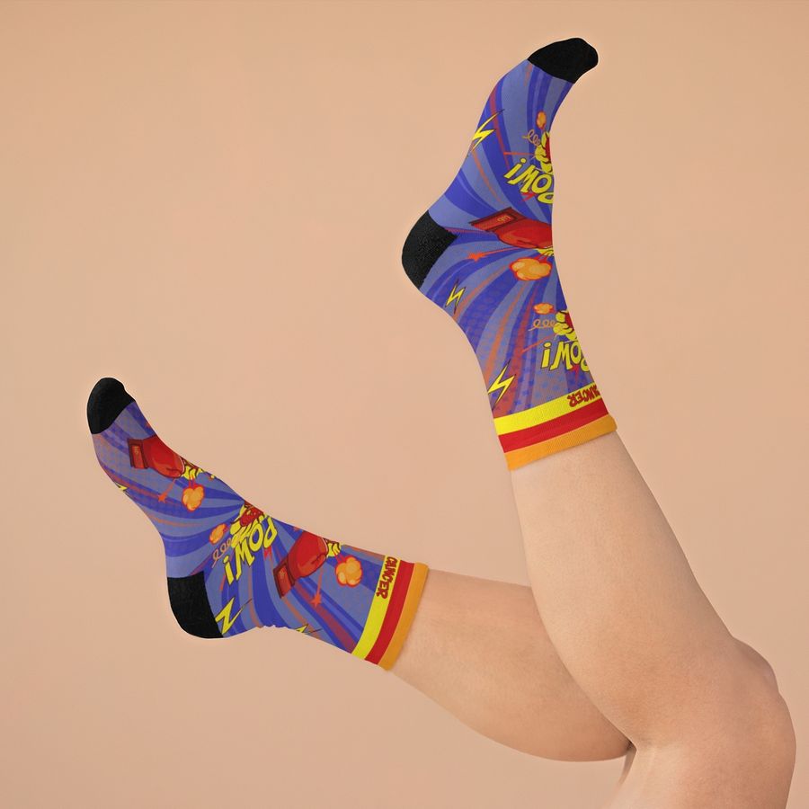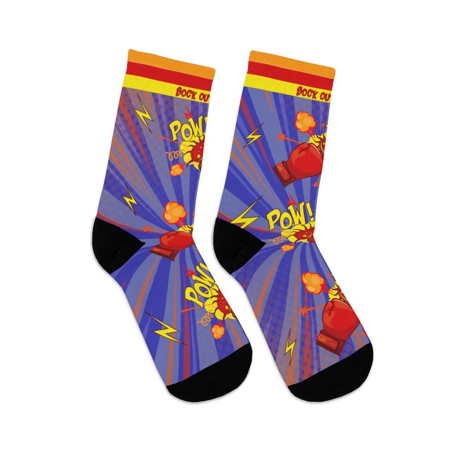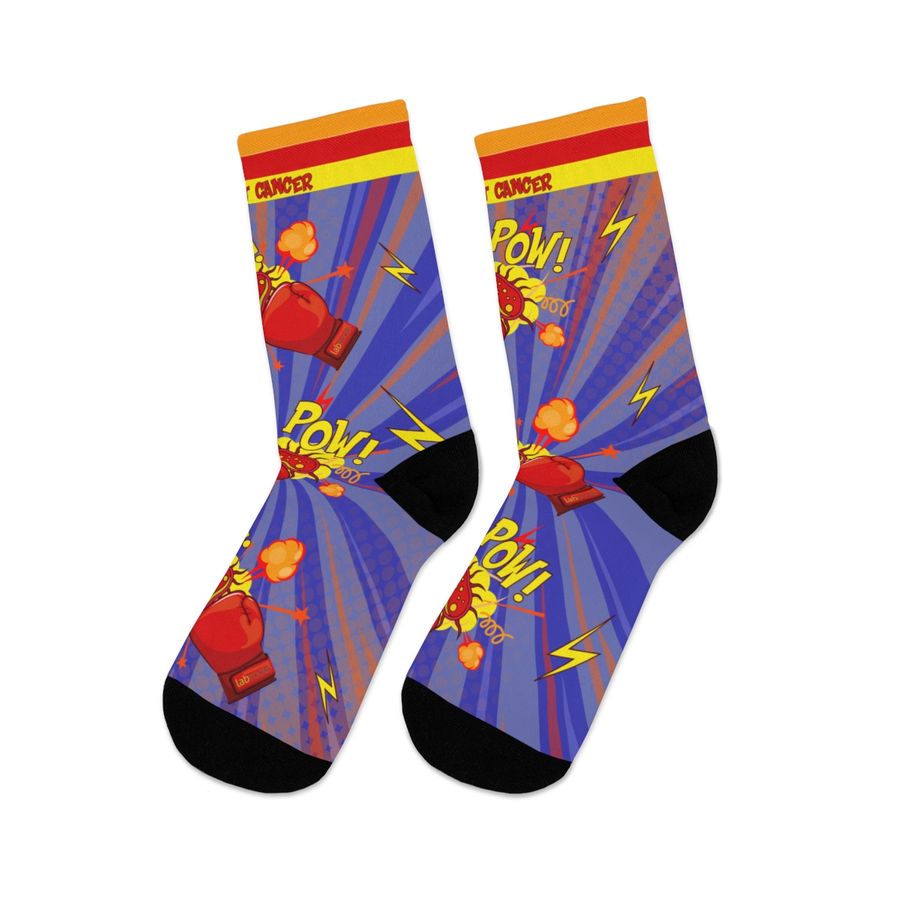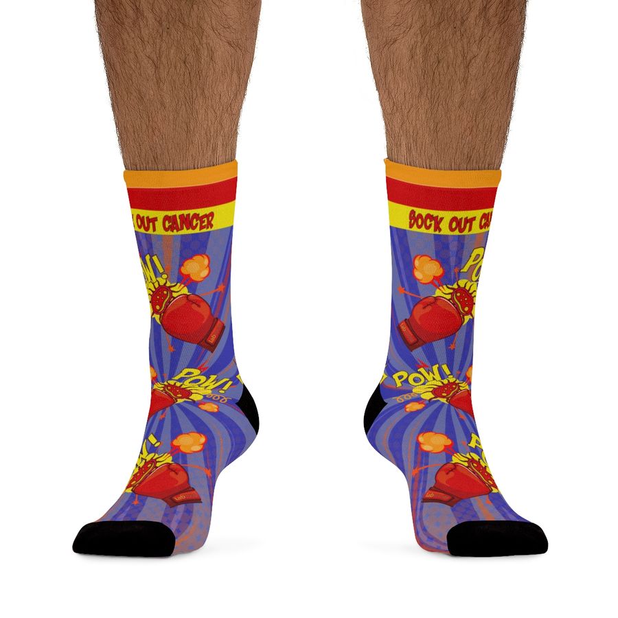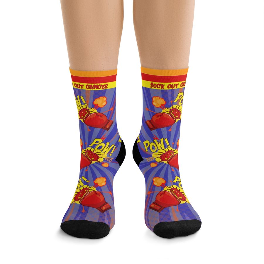 These Unisex, crew-length socks feature a comic book style design with the tagline "Sock Out Cancer".