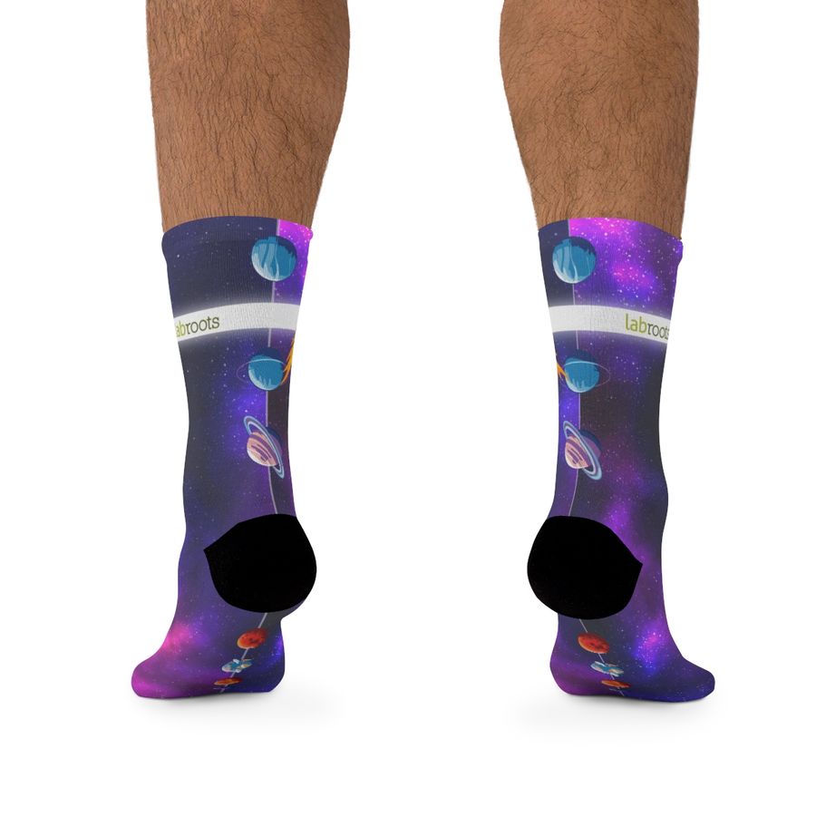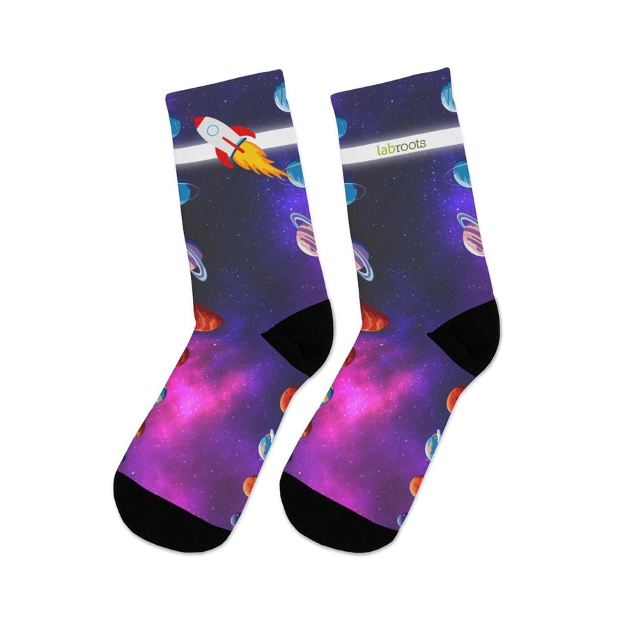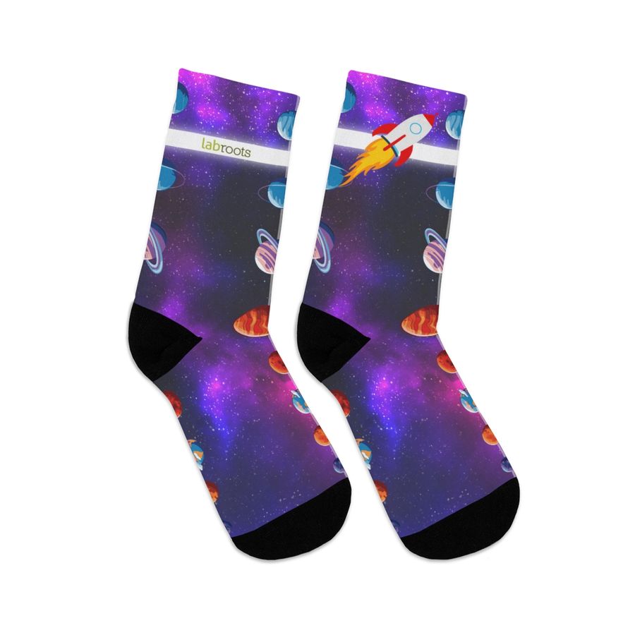 Socks to explore the solar system! These multicolor socks showcase our Solar System with a rocket ship to help you land on whichever planet you desire. These socks are perfect for any astronomy extraordinaire. These socks are made from a blend of 58% Recycled Polyester 22% Nylon 15% Cotton and 5% Elastane. They also fit from a Women's Size 5 (US) up to a Men's Size 12 (US). Sustainability and style pair perfectly in this pair of socks!