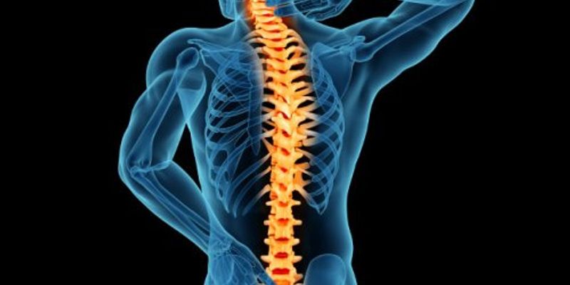 Spine: a series of vertebrae extending from the skull to the small of the back, enclosing the spinal cord and providing support for the thorax and abdomen; the backbone.
