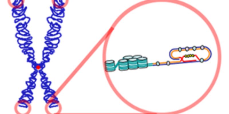 Telomere: region of repetitive nucleotide sequences at each end of a chromosome. Protects the end of the chromosome from deterioration or fusion with neighboring chromosomes.