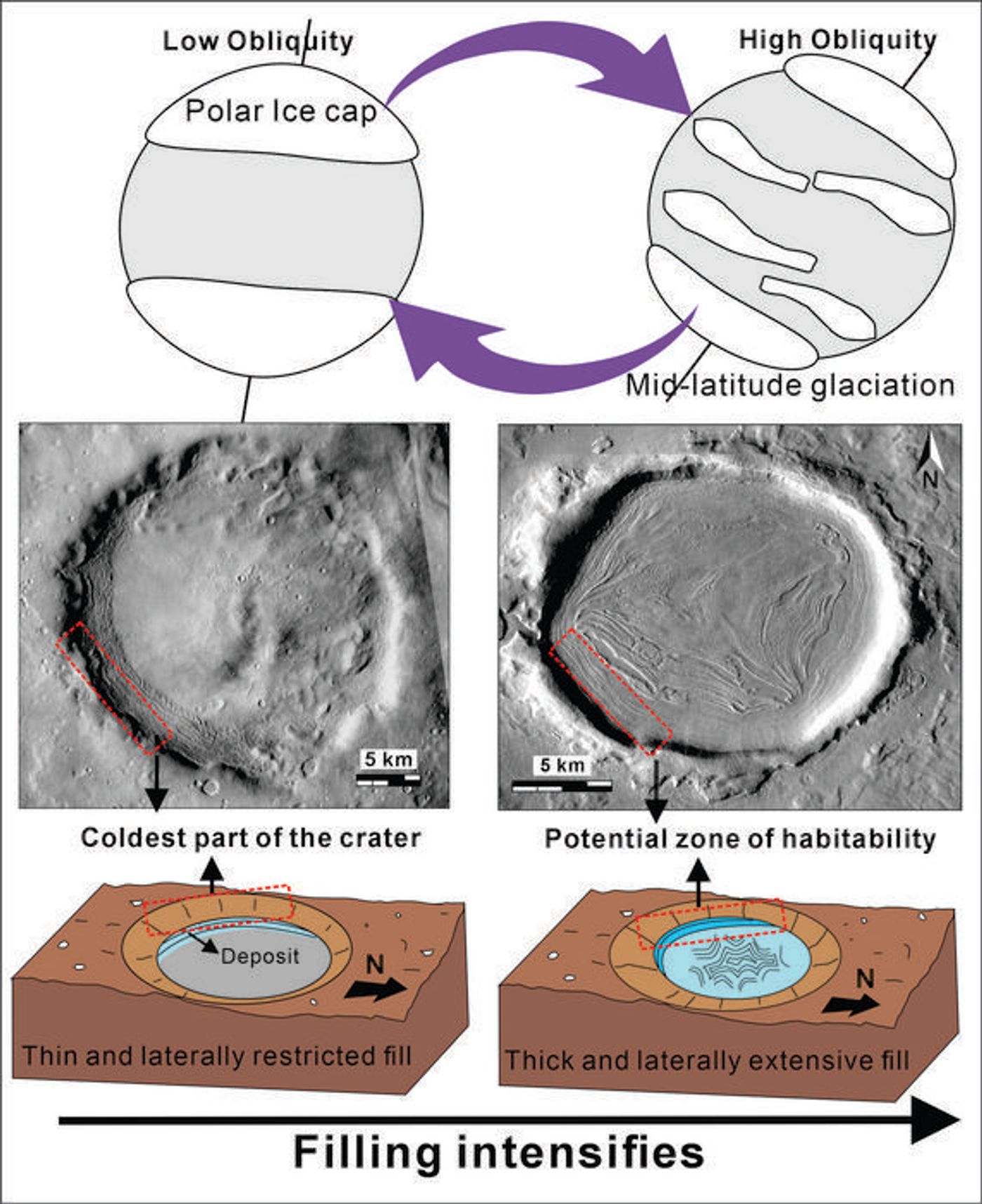 Diagram depicting Mars axial tilt changes, resulting in location changes of ice across the planet, specifically within craters. (Credit: Associate Professor Trishit Ruj from Institute for Planetary Materials, Okayama University, Japan)