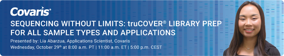 Join us for an in-depth exploration of the truCOVER Library Prep Kit portfolio, designed to streamline whole genome sequencing (WGS) workflows today, with expanded compatibility for whole exome sequencing (WES) and targeted gene panels that will be available later this year. Enabled by Covaris’ proprietary Adaptive Focused Acoustics® (AFA®) technology, truCOVER® enables mechanical fragmentation, consistent insert size control and excellent coverage uniformity — regardless of sample type, GC content, input quality, or input amount.